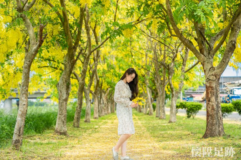 這條藏身於新化崙頂的阿勃勒金色步道,就位於許縣溪旁的河堤道路上,流經新化崙頂的許縣溪,是台南市區鹽水溪的上游,有生命之源的美稱,是先民生活重要的水資源,孕育了無數美麗的生命,其中一段綿延約數公里長的河堤道路,一旁種滿了金黃的阿勃勒,每年到了五六月阿勃勒綻放花季,一片片的金色花瓣隨風落下,黃金雨紛飛的景象浪漫極了!可惜的是每段開的時間不一,今天帶大家一起來看看其中最茂盛的一百公尺金色隧道秘境。