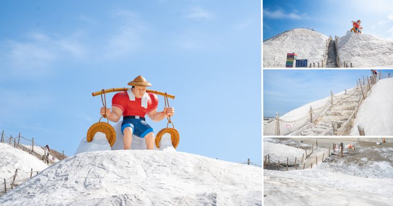 台南七股鹽山每年都會有新的大型裝置藝術於雪白的鹽山頂,2023最新的主題「鹽擔下的獨白」很特別,來了位戴草帽的朋友,辛勤的把用扁擔挑鹽上山,隔著面具的外貌看起來有點熟悉,想想也是合情合理,畢竟航向偉大航道的途中四周都是海,曬點鹽來賣是很正常的!