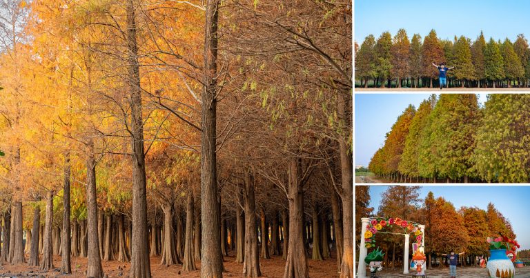 每棵落雨松由綠轉紅的過程進度不同,讓葉子呈現出一層層的漸層色澤,四處走走會發現落雨松的各種樣貌